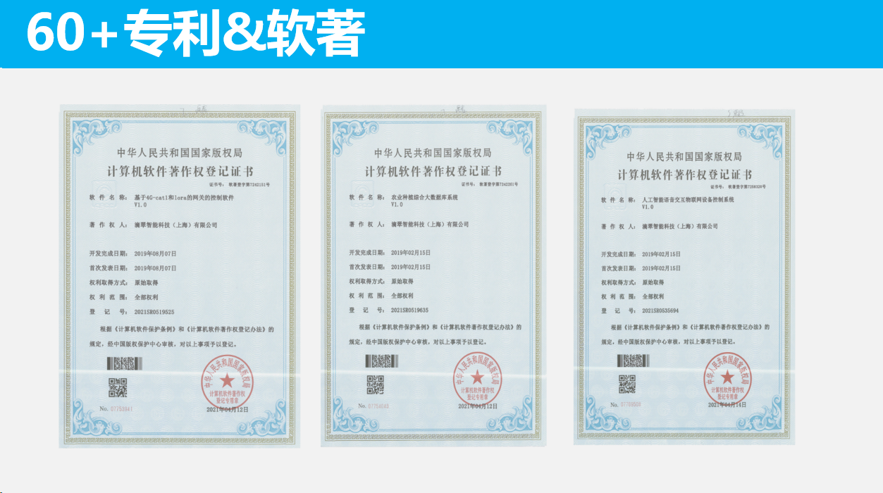 滴翠智能持續(xù)增加研發(fā)資金投入,產(chǎn)品及相關(guān)技術(shù)目前已獲得60+專利&軟著,公司已獲得國(guó)家級(jí)高新技術(shù)企業(yè)、科技型中小企業(yè)、智慧農(nóng)業(yè)領(lǐng)軍企業(yè)、人社部全國(guó)優(yōu)秀創(chuàng)業(yè)創(chuàng)新項(xiàng)目等榮譽(yù)和認(rèn)證。