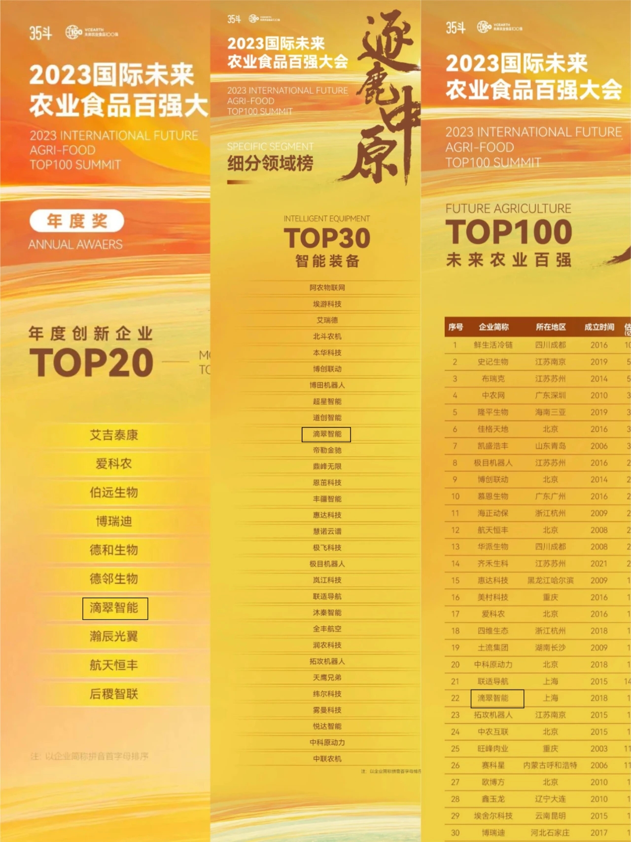 大會以全球視野、創(chuàng)新視角,打造未來農業(yè)領域政、產、學、研、投融合的交流平臺,邀請農業(yè)領域院士專家、企業(yè)家、投資家等行業(yè)翹楚,深入探討未來農食新業(yè)態(tài)、新模式、新發(fā)展。"國際未來農業(yè)食品百強榜"迄今已連續(xù)發(fā)布 4 次,為國內首個面向農業(yè)食品創(chuàng)新領域的產業(yè)榜單,包括“中國未來農業(yè) 100 強榜”和數字農業(yè)、種業(yè)創(chuàng)新、生物合成、農食供應鏈、電商零售等若干細分領域榜單,意在遴選真正代表農業(yè)食品發(fā)展方向的產業(yè)創(chuàng)新者,發(fā)現產業(yè)創(chuàng)新的核心推動力。滴翠智能榮登榜單,標志著公司在農業(yè)產業(yè)升級道路上的探索和創(chuàng)新,得到了行業(yè)的充分認可。